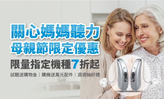 聽寶關心媽媽聽力 推出母親節限定4大優惠 購機享折扣再送萬元配件,還可以抽小家電喔 試聽分享5星好評,立刻送全聯禮券300元(限量)